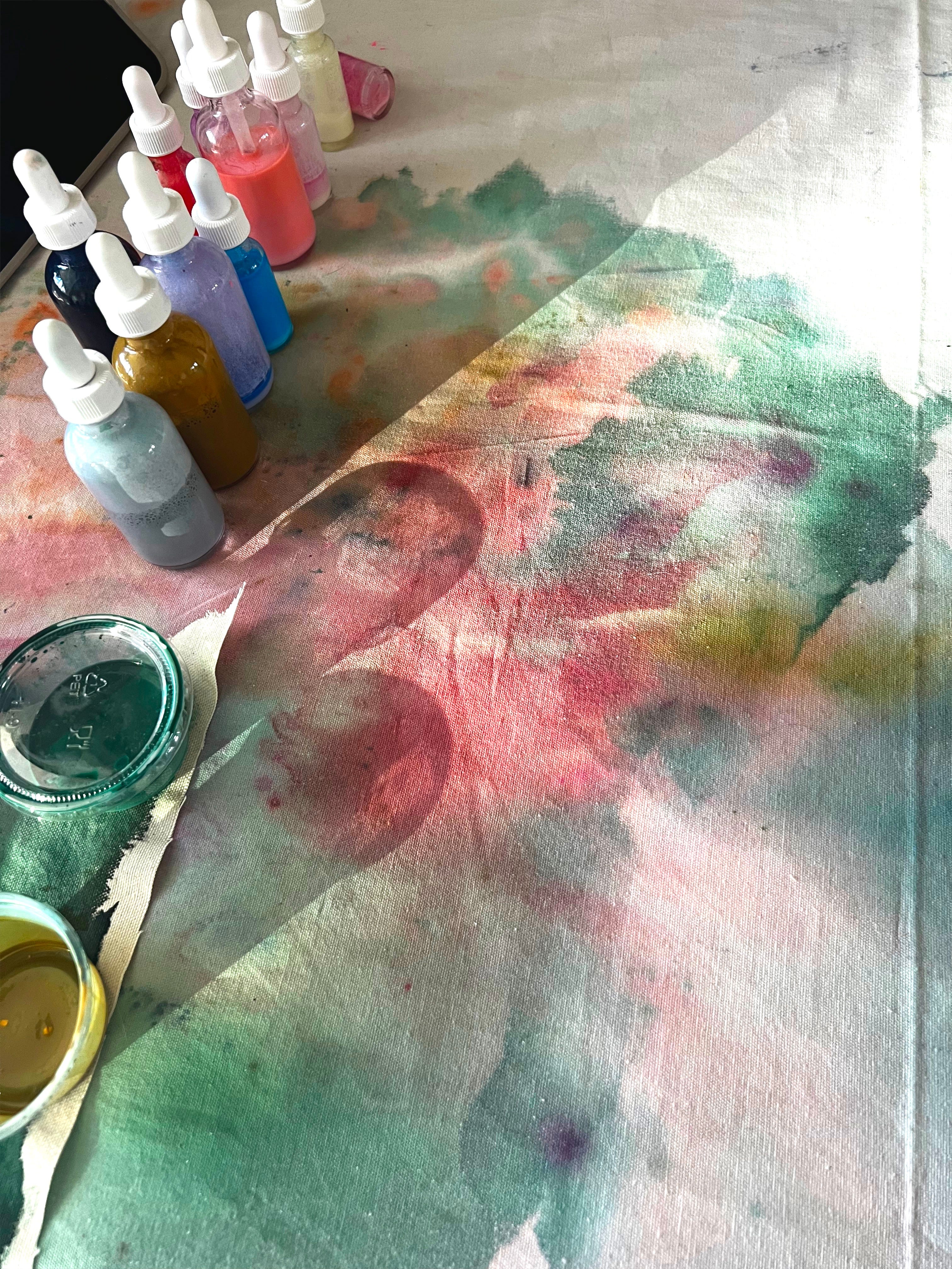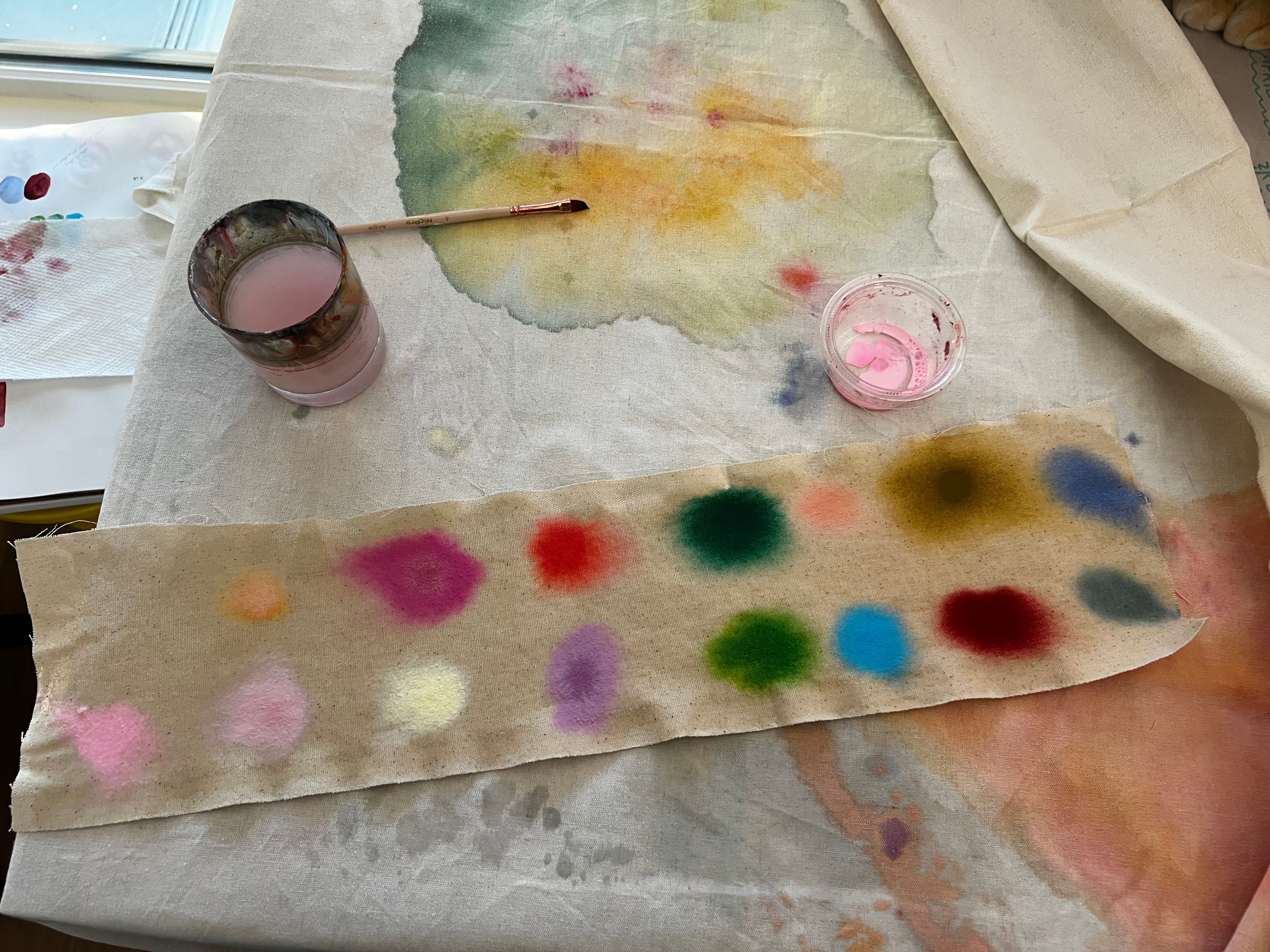 For more than a decade before, I had been doing that but digitally and with words, using software and poetry. But in the fall of 2024, after my living situation had stabilized, I decided (surrendered?) to trying something different, to satisfy the persisting itch of working with colour outside of what I had become comfortable with. First a poem printed, then pencil crayon, then paint, pigment, pastel, water, ink, back to the computer but with motion and code, then back to paint. I wasn’t used to it. I hadn’t touched paint or fabric in more than a decade, for a reason. Everything was much easier and faster using a colour selector tool on the computer, of course, or simply calling out a colour using words to try to contain a meaning. I loved not having to get messy.