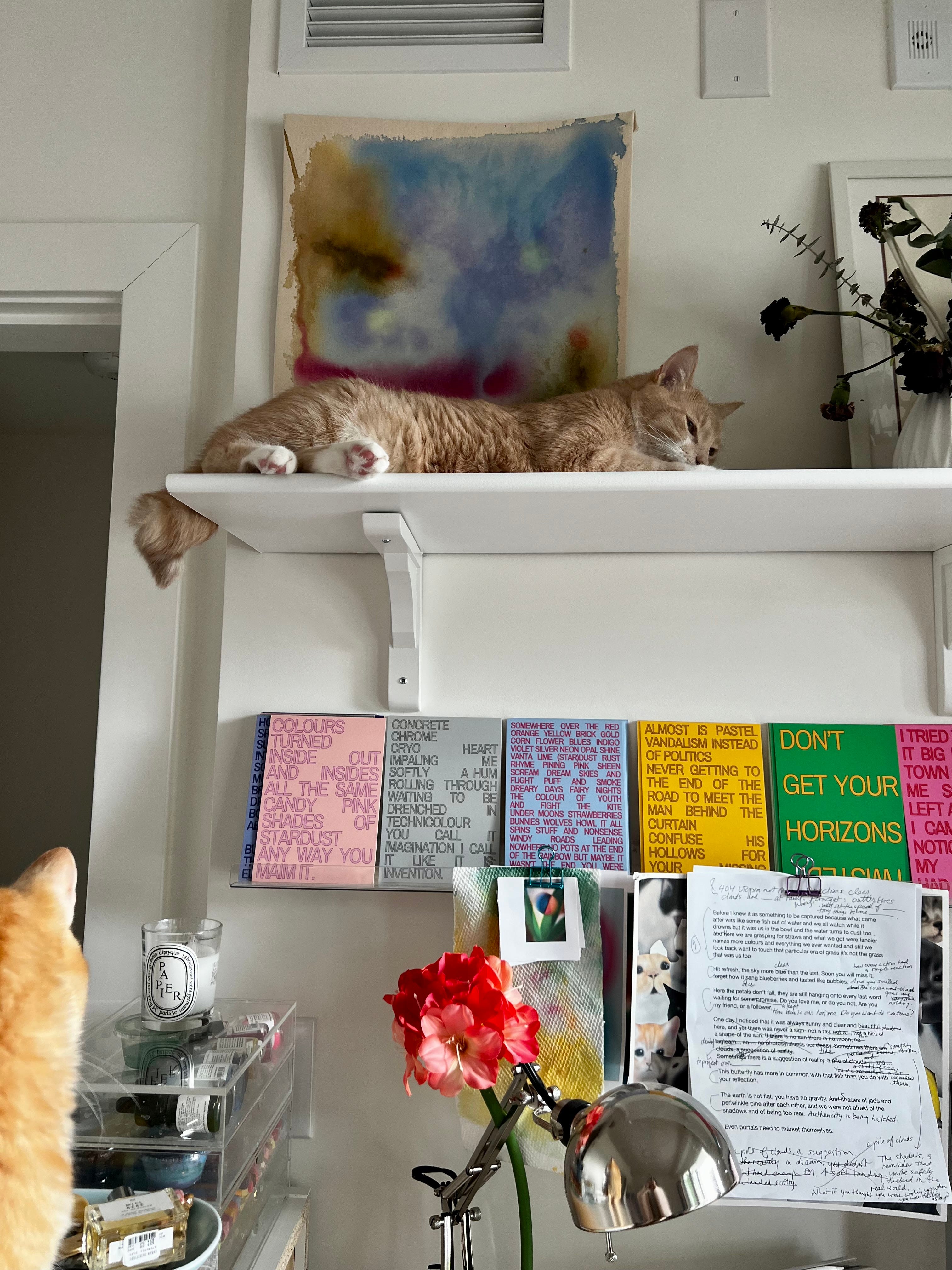 Colour is so small and yet so big. It’s so much distilled and so much contained. The thing is, when I opened myself up to working with colour and seeing it in all different kinds of ways—through science, poetry, material, psychology, history—I was able to create and communicate things I couldn’t quite before, like I was orbiting but afraid to land in the mud of the work. It gave me more to work with: some things you can see (ie. the subtleties of light in real life: shimmer, translucency, gloss, movement), and some things you can’t.